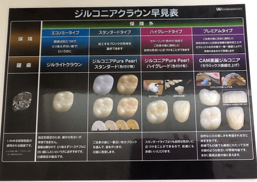 かぶせ物と聞くとイコール”銀歯”とイメージされると思いますが、今は審美性、耐久性、安全性を考慮したかぶせ物を希望される患者様も多くいらっしゃるので医院でも患者様のニーズにお応えできるように種類も豊富です。