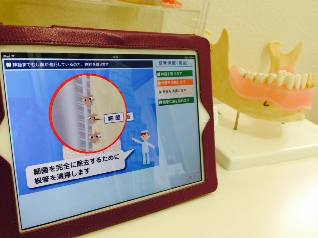 てらさき歯科医院では、患者様により説明の内容などわかりやすくお伝えするためにIpadで治療のアニメーションを見ていただいたり実際の模型を見ていただいたりしています。