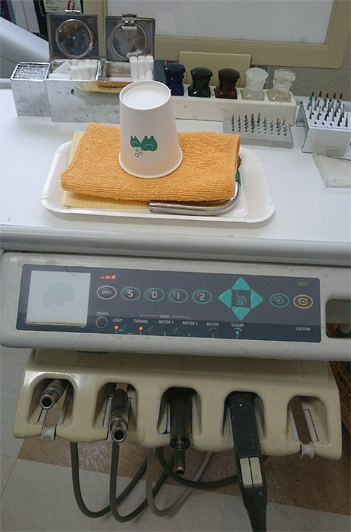 患者様が入られた時には、新しい使い捨てのトレーやコップ、エプロンを準備。