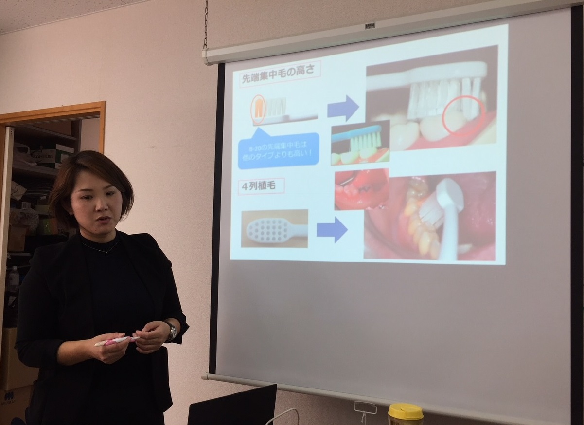 そして、今回は、“世界有数の歯科医療メーカー「ジーシー」”で勤務されている歯科衛生士の古谷さんを外部講師として『歯ブラシの選び方』についてのセミナーをしていただきました。