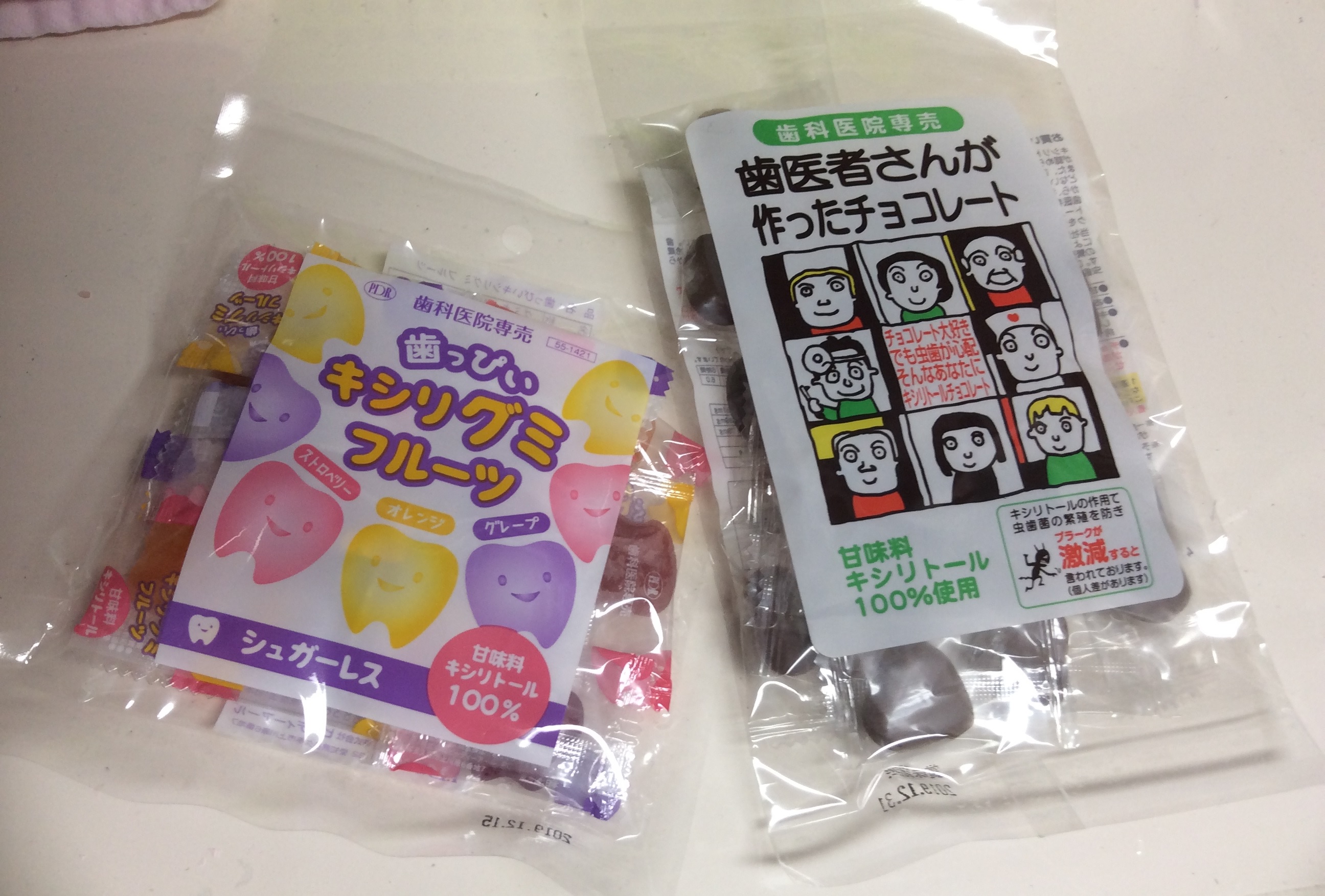 読みながら「歯医者でグミ?」「チョコはむし歯になるって言うのに」と思われた方もいたかと思います。しかし当院でお配りしたのは、むし歯にならないチョコ、グミなんです!☆さらにはむし歯を予防するという嬉しい効果もあります!その理由は「甘味料がキシリトール100%」だからです!!