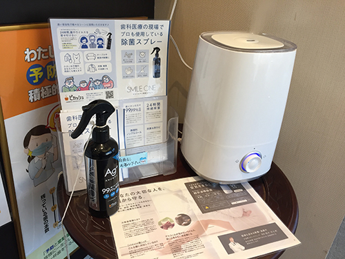 次亜塩素酸を使用した超音波噴霧器や、マスクにも使用できる除菌スプレーを設置しています。