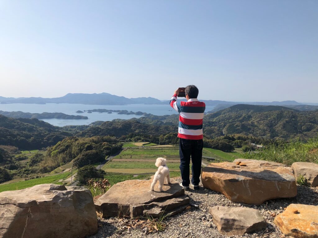 ≪平戸を望む高台で写真撮影中>