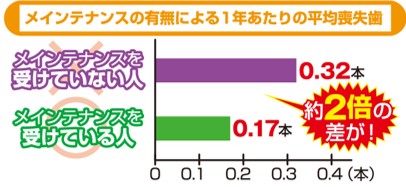 定期的なメインテナンスを受けているかどうかで、歯を失う数に約2倍も差が出ると言われています。