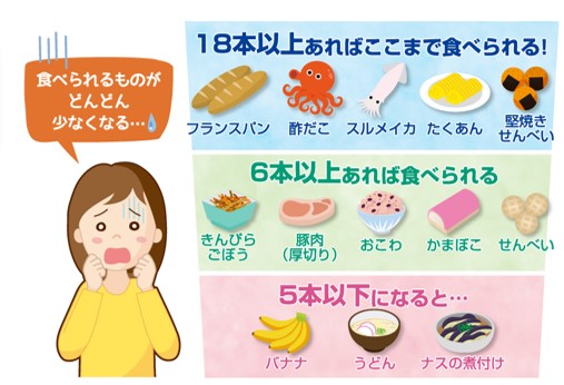 おこわや豚肉といったものでさえ6本以上必要で、それ以下になるとうどんやバナナなど、やわらかいものしか食べられなくなってしまうのです。