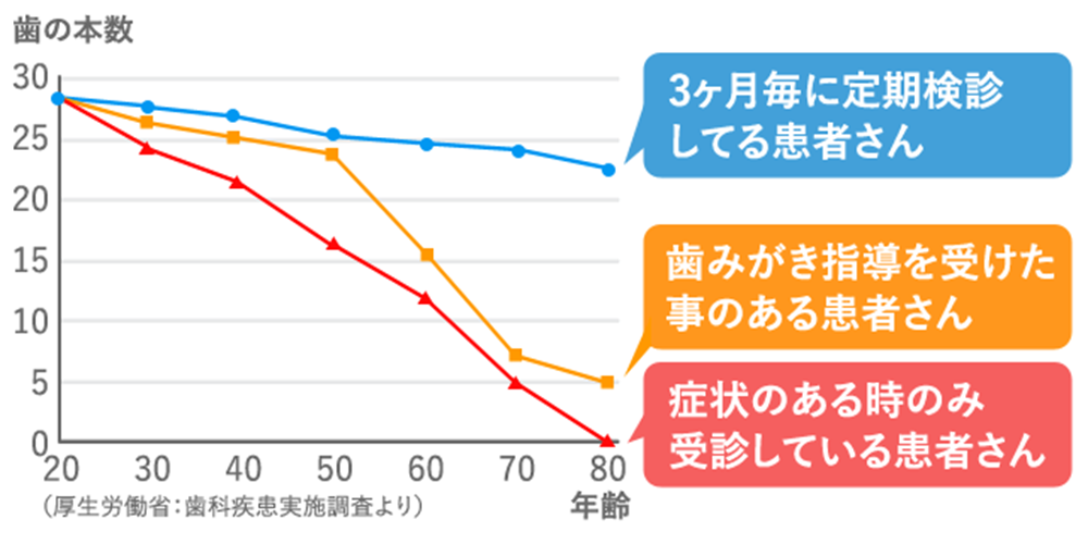 グラフから見て分かるように、定期健診を受けていた人は症状があったときのみに受診していた人に比べて、圧倒的に現存歯数(残っている歯の本数)が高くなっています。