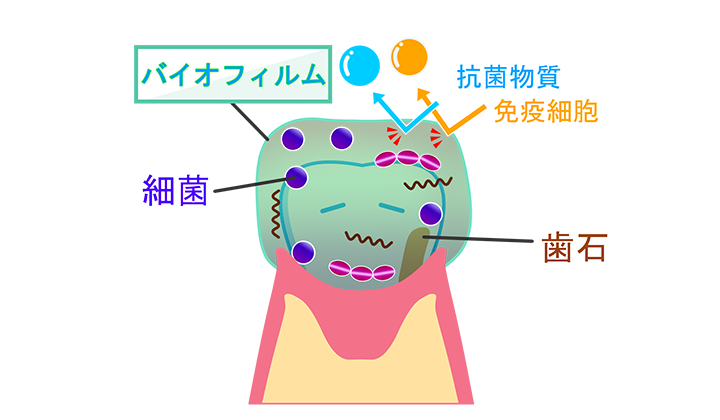 バイオフィルムとは、歯の表面にできる細菌がつくる強固な膜です。この膜に守られることで、細菌はどんどん増殖します。